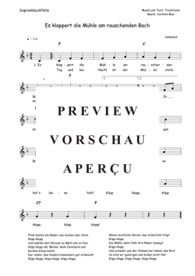 Es klappert die Mühle am rauschenden Bach (F - Dur) - Sheet Music for soprano recorder solo Traditional