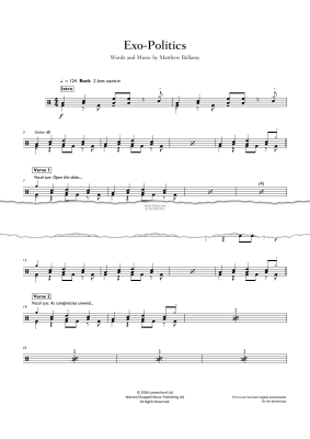 Exo-Politics by Muse, arranged in drum chart format to follow the parameters for Grades 4 to 5 as set out by Trinity for the βown choice songβ option in their Rock & Pop exams.