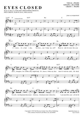 Eyes Closed - Sheet Music for Voice with Piano Accompaniment Ed Sheeran