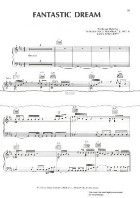 Fantastic Dream written by Marian Gold, Bernhard Lloyd and Rick Echolette, as performed by Alphaville arranged for voice and piano with guitar chords.