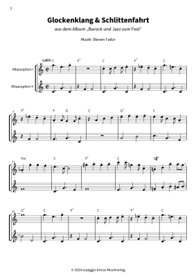 This sheet music book contains the sheet music for the Christmas carol "GlockenklangundSchlittenfahrt" by Steven Tailor. Edition for alto saxophone duo in easy difficulty in E flat major. (From the album Barock und Jazz zum Fest)