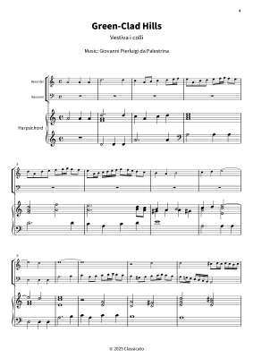 Published in 1566 within Palestrina's fifth book of madrigals, "Vestiva i colli" stands as one of the Renaissance's most beloved secular works. This chamber trio arrangement follows the model set by Bartolomeo de Selma y Salaverde, the Venetian bassoon virtuoso whose 1638 collection Canzoni, fantasie et correnti pioneered idiomatic writing for the instrument. The recorder presents the luminous soprano line with airy grace, while the bassoon intertwines alto and tenor voices in rich, earthy resonance-alternating between octaves and independent motion to preserve Palestrina's imitative counterpoint. The harpsichord provides a transparent basso continuo, its sparse chords supporting rather than overshadowing the polyphony. Thus Green-Clad Hills unfolds as a miniature sound-painting: a serene, melancholic stroll through springtime landscapes where Renaissance clarity meets the emerging warmth of Baroque expression.