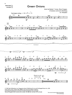 Green Onions, written by Booker T Jones, Steve Cropper, Al Jackson Jr and Lewis Steinberg arranged by Andy Hampton for tenor saxophone with piano accompaniment in digital sheet music format. This piece is presented with extra helpful soloing guides to create authentic jazz solos.