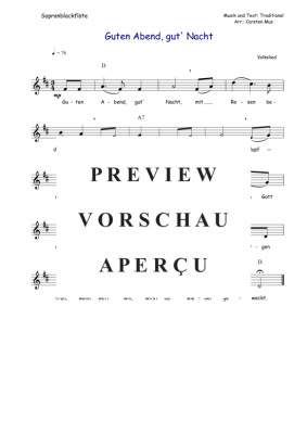Guten Abend gut ´ Nacht (D - Dur) - Sheet Music for soprano recorder solo + chords Traditional