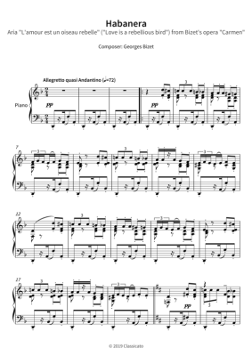 Habanera - Aria L´amour est un oiseau rebelle (Love is a rebellious bird) - Sheet Music for from Bizet´s opera Carmen piano solo Georges Bizet