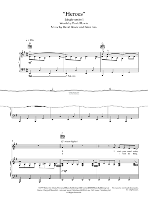 Heroes [single version], as performed by David Bowie. Arranged for piano and voice with guitar chords in digital sheet music format.