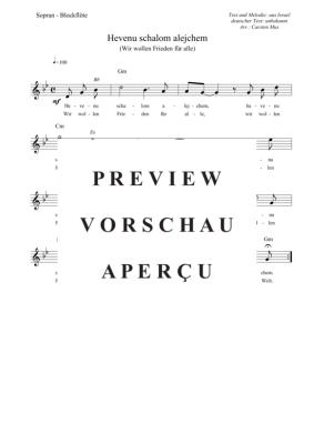 Hevenu schalom alejchem - Wir wollen Frieden für alle. Ein Arrangement für Sopran-Blockflöte mit Liedtext zum Mitsingen. Für den fortgeschrittenen bestens geeignet.