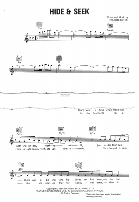 Hide And Seek, as performed by Howard Jones, arranged for voice with melody line, words and guitar chords and available to print instantly at home.