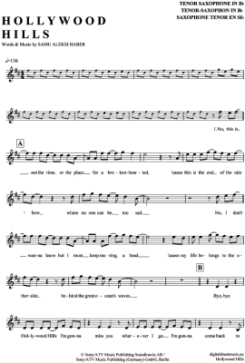Hollywood Hills - Sheet Music for Tenor Saxophone Sunrise Avenue