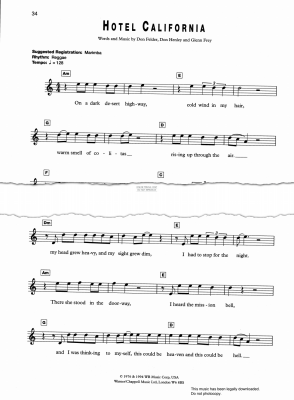 Hotel California, written by Don Felder, Don Henley and Glenn Frey, arranged for voice and easy keyboard with guitar chords.