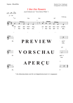 I like the flowers, auch bekannt als " Zwei kleine WΓΆlfe" ist ein beliebter Folksong mit einer Liedstrophe in deutsch und in englisch. Das ist Lied ist fΓΌr den fortgeschrittenen bestens geeignet und soll im Easy - Swing gespielt werden (G-Dur). Dazu Atemzeichen, Tempoangabe, und die Akkordsymbole fΓΌr ein Begleitinstrument in C.
