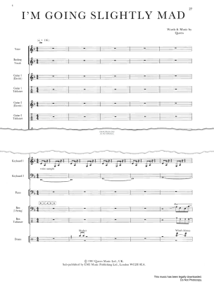 I'm Going Slightly Mad, as performed by Queen, from their fourteenth studio album Innuendo (1991), written by Freddie Mercury, Brian May, Roger Taylor and John Deacon, arranged for full band score (bass guitar, drums, guitar, piano and voice) and available to print instantly at home in digital sheet music format. Official, artist-approved.