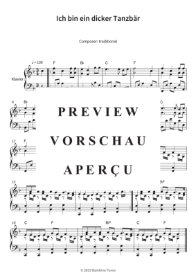 Dieses Notenheft enthält die Originalnoten zum Kinderlied "Ich bin ein dicker Tanzbär" für Klavier. Leichter Schwierigkeitsgrad in F-Dur.
