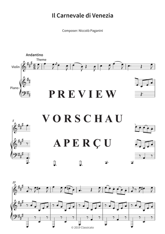 Dieses Notenheft enthält die Originalnoten zum klassischen Stück "Il Carnevale di Venezia" für Klavier und Violine. Mittlerer Schwierigkeitsgrad in A-Dur.