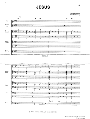 Jesus, as performed by Queen, from their eponymous debut album (1973), written by Freddie Mercury, arranged for full band score (bass guitar, drums, guitar, piano and voice) and available to print instantly at home in digital sheet music format. Official, artist-approved.