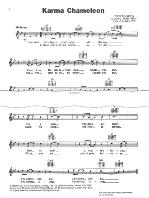 Karma Chameleon, as performed by Culture Club, arranged for voice with melody line, words and guitar chords and available to print instantly.