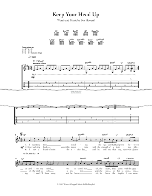 The official guitar tab arrangement of Keep Your Head Up by Ben Howard. Features accurate, artist-approved transcriptions of the songs, using the authentic tunings for Ben's style of finger-picking guitar. From the Mercury Prize nominated album Every Kingdom.