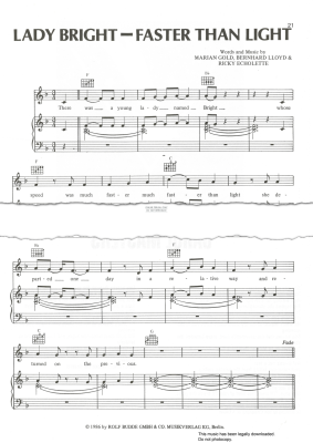 Lady Bright - Faster Than Light written by Marian Gold, Bernhard Lloyd and Rick Echolette, as performed by Alphaville arranged for voice and piano with guitar chords..