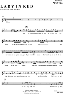 Lady in Red - Sheet Music for recorder Chris de Burgh