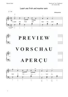 The song "Lasst uns froh und munter sein" is a well-known St. Nicholas song. The lyrics and melody date back to the 19th century. The song describes the children's anticipation of the feast of St. Nicholas and is often played as an Advent and Christmas carol. A medium-light version with broken chords for the slightly advanced pianist. The song is ideal for practicing and performing. The tempo, volume markings, fingerings, chord symbols and 5 verses to sing along to in F major are included.