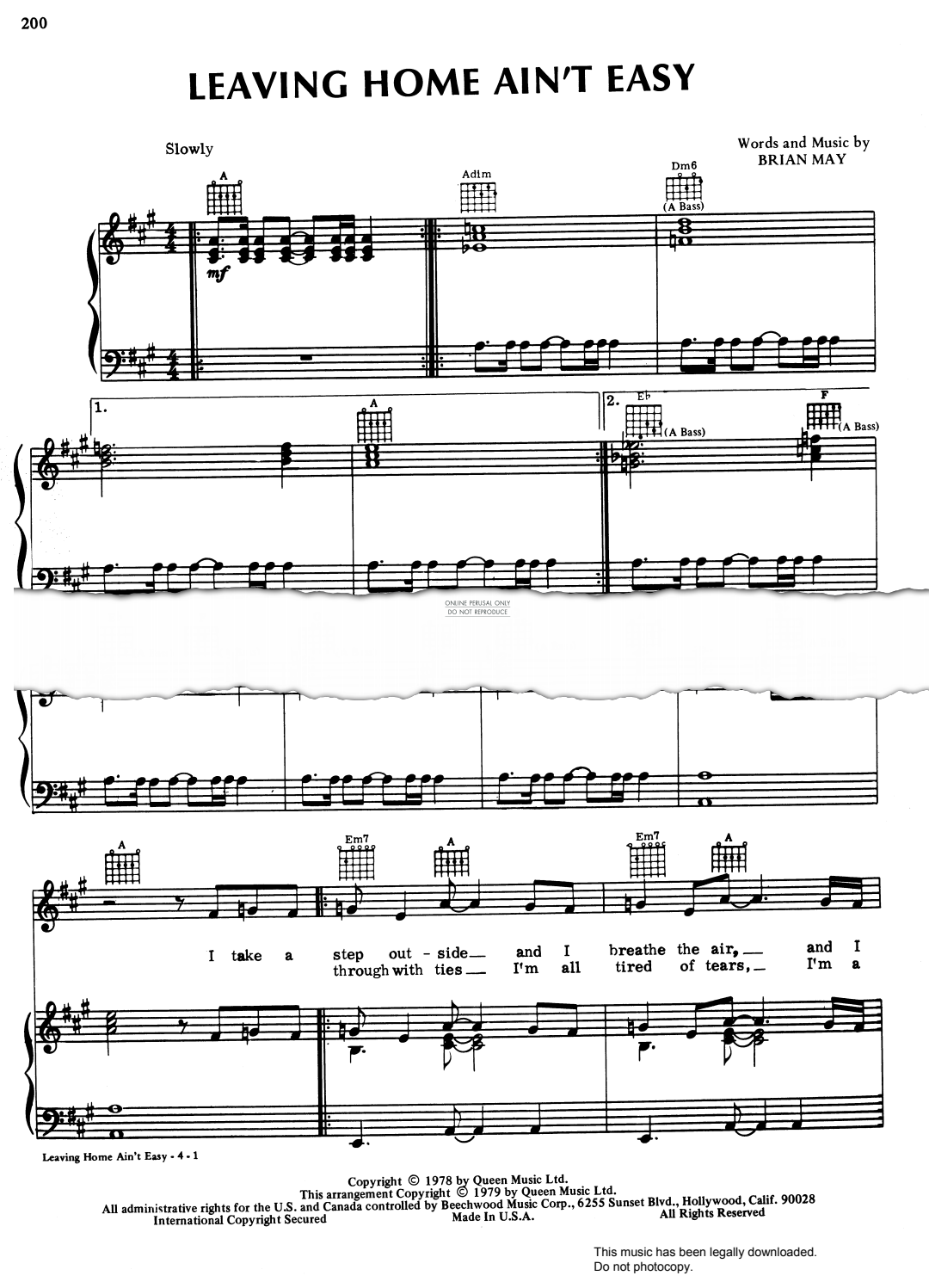 Leaving Home Ain't Easy, as performed by Queen, from their seventh studio album Jazz (1978), written by Brian May, arranged for piano and voice with guitar chords and available to print instantly at home in digital sheet music format. Official, artist-approved.