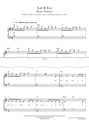 Let It Go, by Idina Menzel, from 'Frozen'. Arranged for easy piano and voice with guitar chords in digital sheet music format.