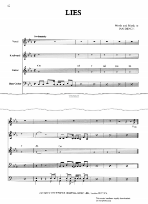 Lies, as performed by EMF from the album Schubert Dip, in the key of C Minor arranged for voice, piano, guitar, bass guitar and drums.