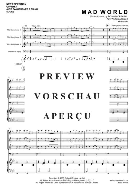 Mad World (3x Alt Saxophon + Klavier, Violoncello opt.)