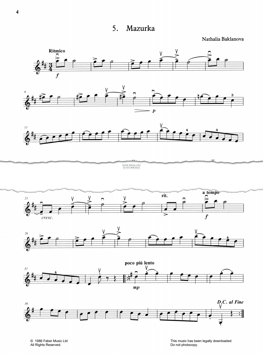 Mazurka, composed by Natalja Baklanova and arranged for violin with piano accompaniment. Taken from The Young Violinist's Repertoire Book 3, pieces for violin selected and edited by Paul de Keyser and Fanny Waterman.