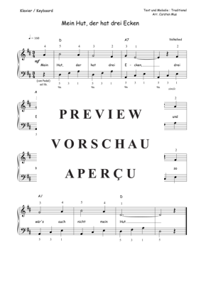 Mein Hut, der hat drei Ecken (D-Dur) - Sheet Music for Piano Easy Traditional