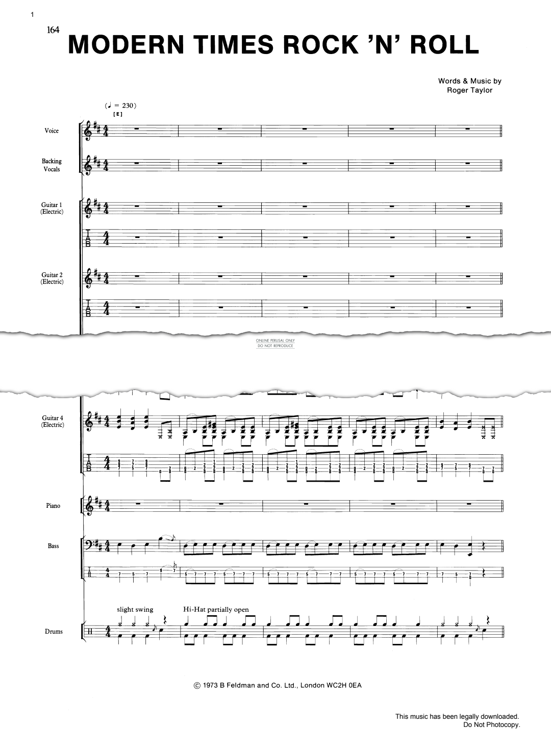 Modern Times Rock 'N' Roll, as performed by Queen, from their eponymous debut album (1973), written by Roger Taylor, arranged for full band score (bass guitar, drums, guitar, piano and voice) and available to print instantly at home in digital sheet music format. Official, artist-approved.