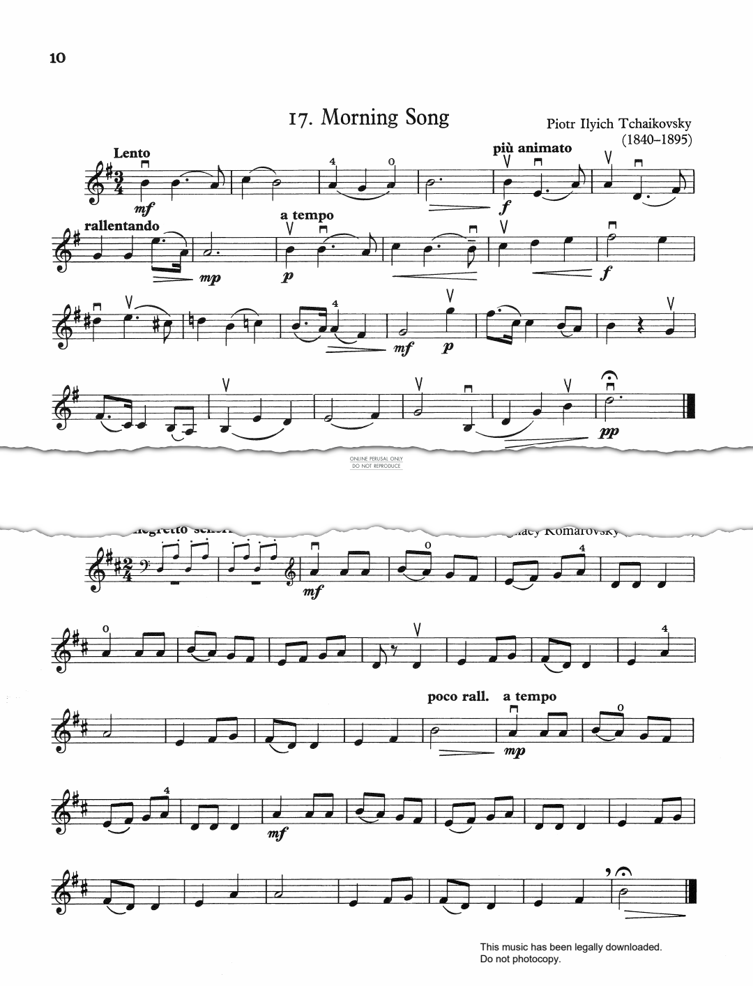 Morning Song, composed by Pyotr Ilyich Tchaikovsky and arranged for violin with piano accompaniment. Taken from The Young Violinist's Repertoire Book 1, pieces for violin selected and edited by Paul de Keyser and Fanny Waterman.