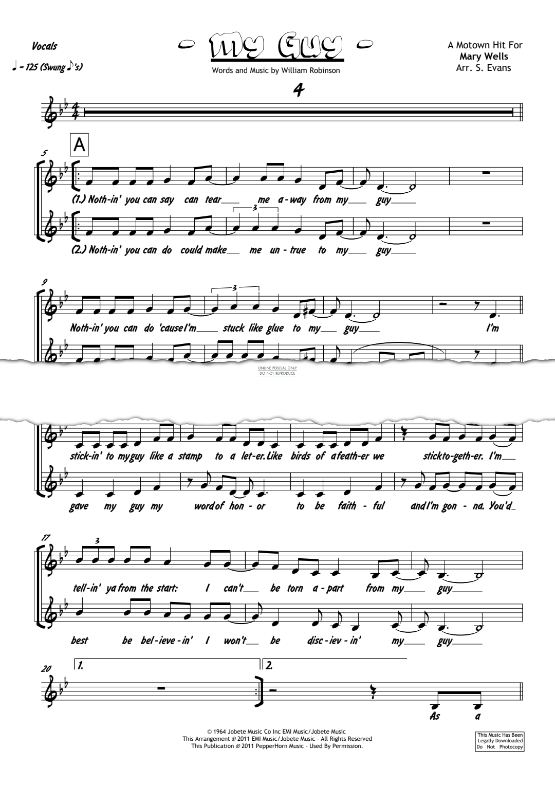 My Guy was a 1964 #1 Hit for Mary Wells and the Motown label.  The Motown standard, penned by Smokey Robinson has since been covered by such artists as The Supremes, Sister Sledge, Petula Clark and  Aretha Franklin.  Although it was Wells' last hit single for Motown it has lived on as a signature tune for it's first female star.  This chart has been professionally arranged for 4 Horns (Trumpet I & II, Alto, Tenor & Bari Sax, Trombone), 4 Rhythm (Drums, Guitar, Bass, Keyboards), Vocals and Background Vocals by Shaun Evans.  It is presented as part of the PepperHorn Collections series form PepperHorn Music.