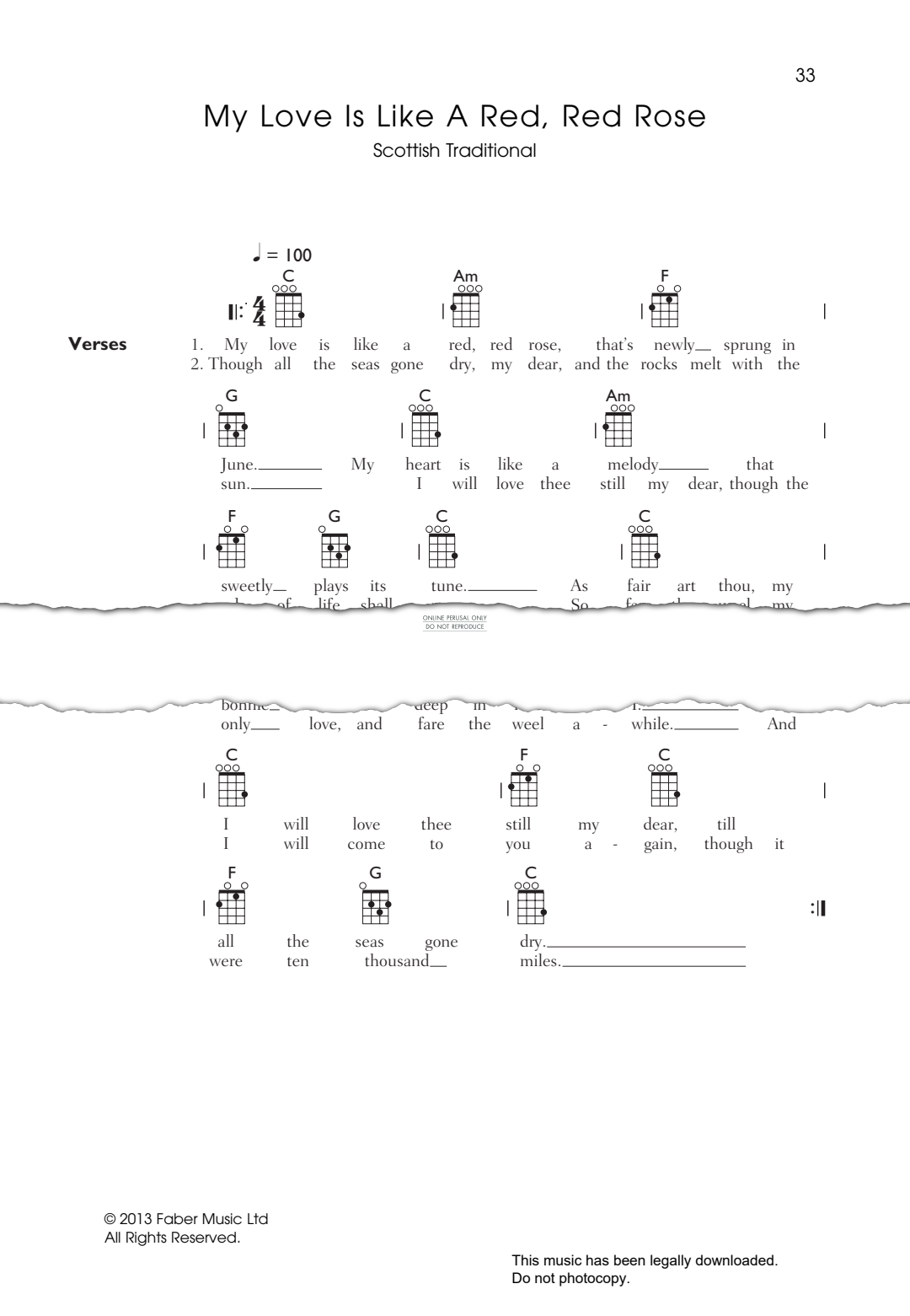 The traditional folk song My Love Is Like A Red, Red Rose. Arranged for voice with ukulele chords in digital sheet music format.