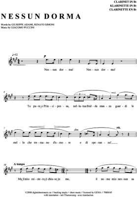 Nessun dorma - Sheet Music for Clarinet in B-flat Paul Potts / G. Puccini