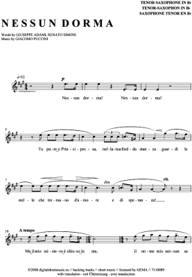 Nessun dorma - Sheet Music for Tenor Saxophone Paul Potts / G. Puccini