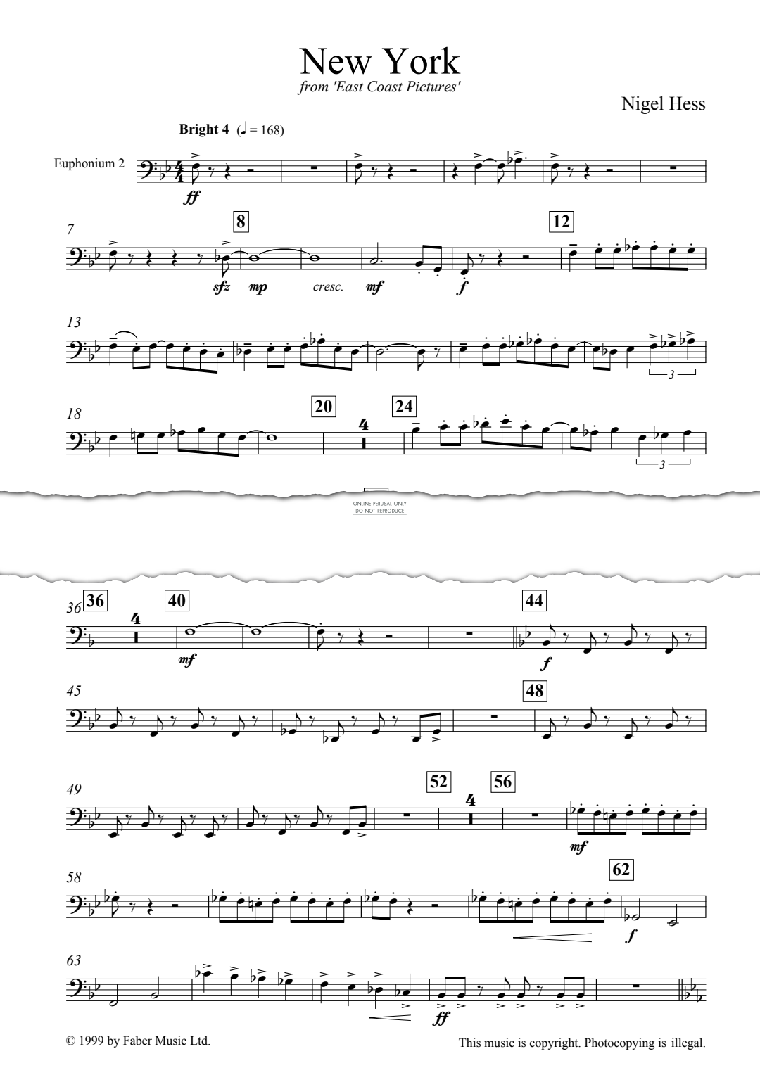 New York taken from 'East Coast Pictures', composed by Nigel Hess. This is the bass clef version of the EuphoniumΒ 2 in C part available in digital sheet music format.