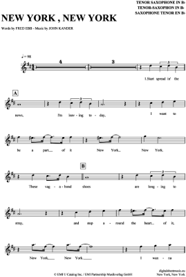 New York, New York - Sheet Music for Tenor Saxophone Frank Sinatra