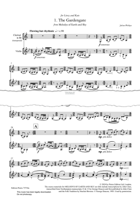No.1: The Gardengate, composed by Julian Philips, taken from Melodys Of Earth And Sky (2022). Nine creative transcriptions from the fiddle tune books of poet John Clare for Clarinet in Bb and Violin in digital sheet music format [EP73734a].