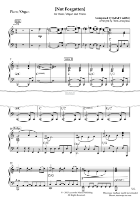 The piano/organ part to Not Forgotten, composed by Matt Goss and arranged by Eva Donoghue for VE Day 2025. Available to print instantly in digital sheet music format.