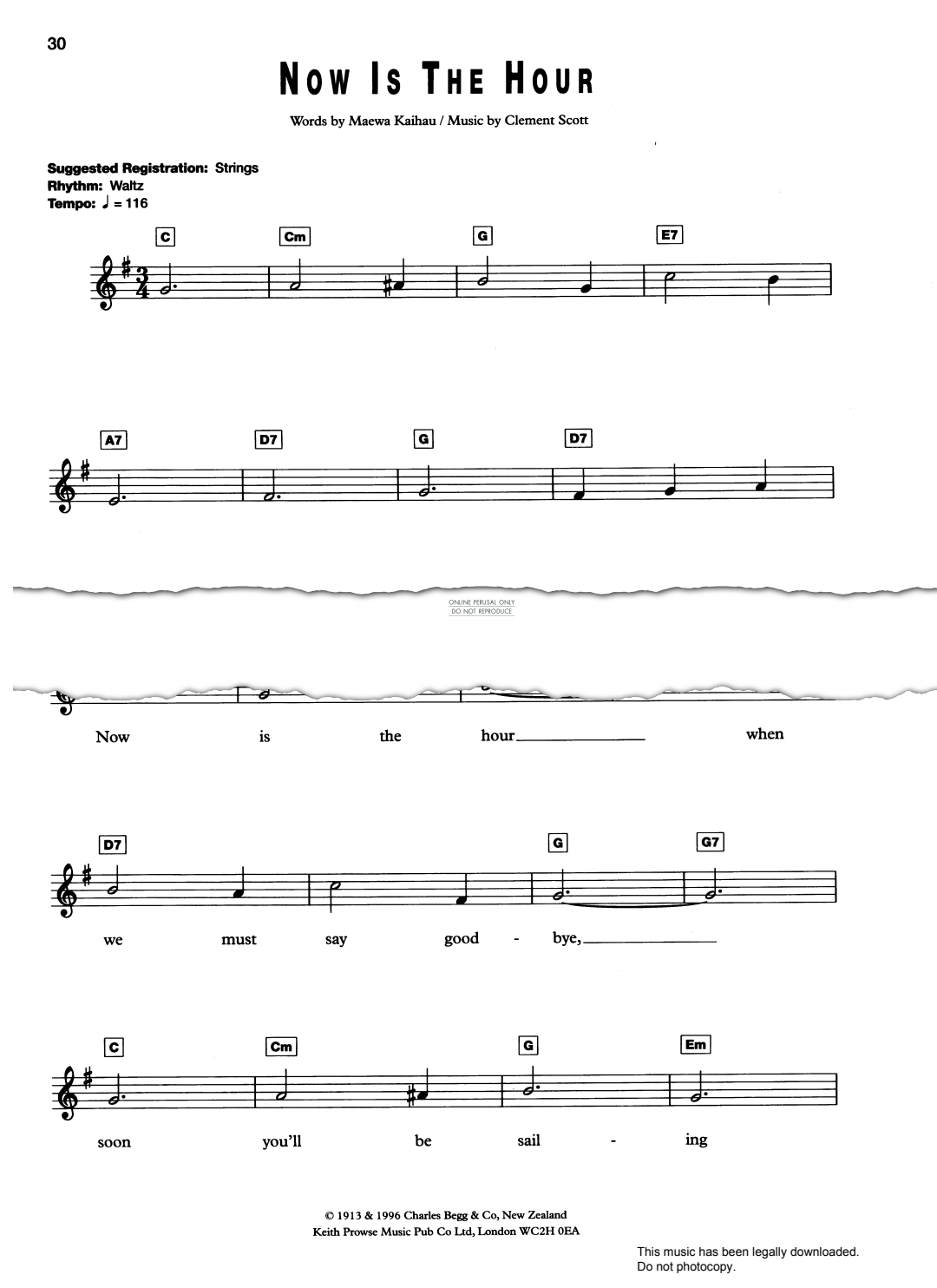 Now Is The Hour, a Maori war song, composed by Clement Scott with words by Maewa Kaihau in the key of G Major arranged for voice and keyboard.