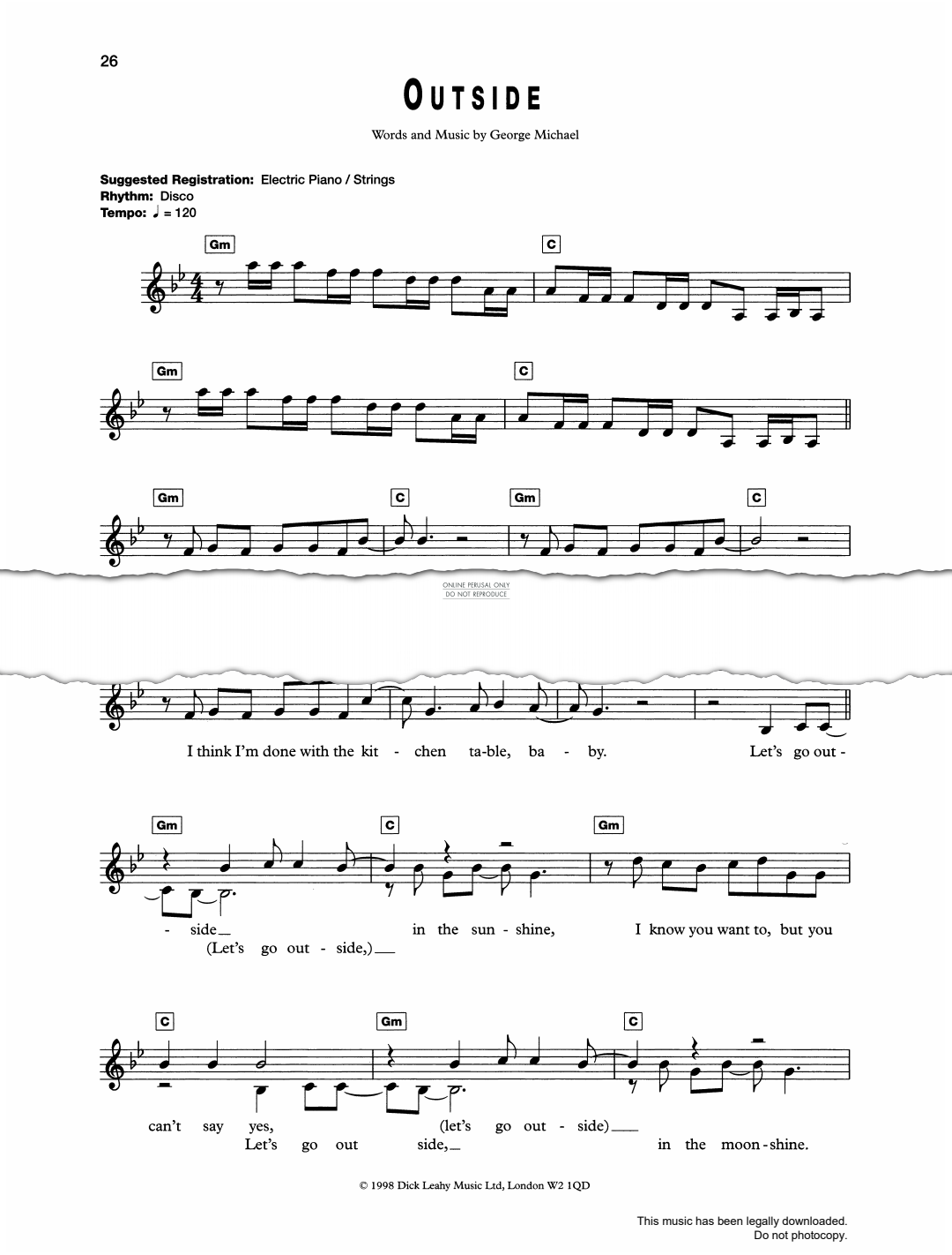 Outside, as recorded by George Michael, arranged for voice and easy keyboard with guitar chords.