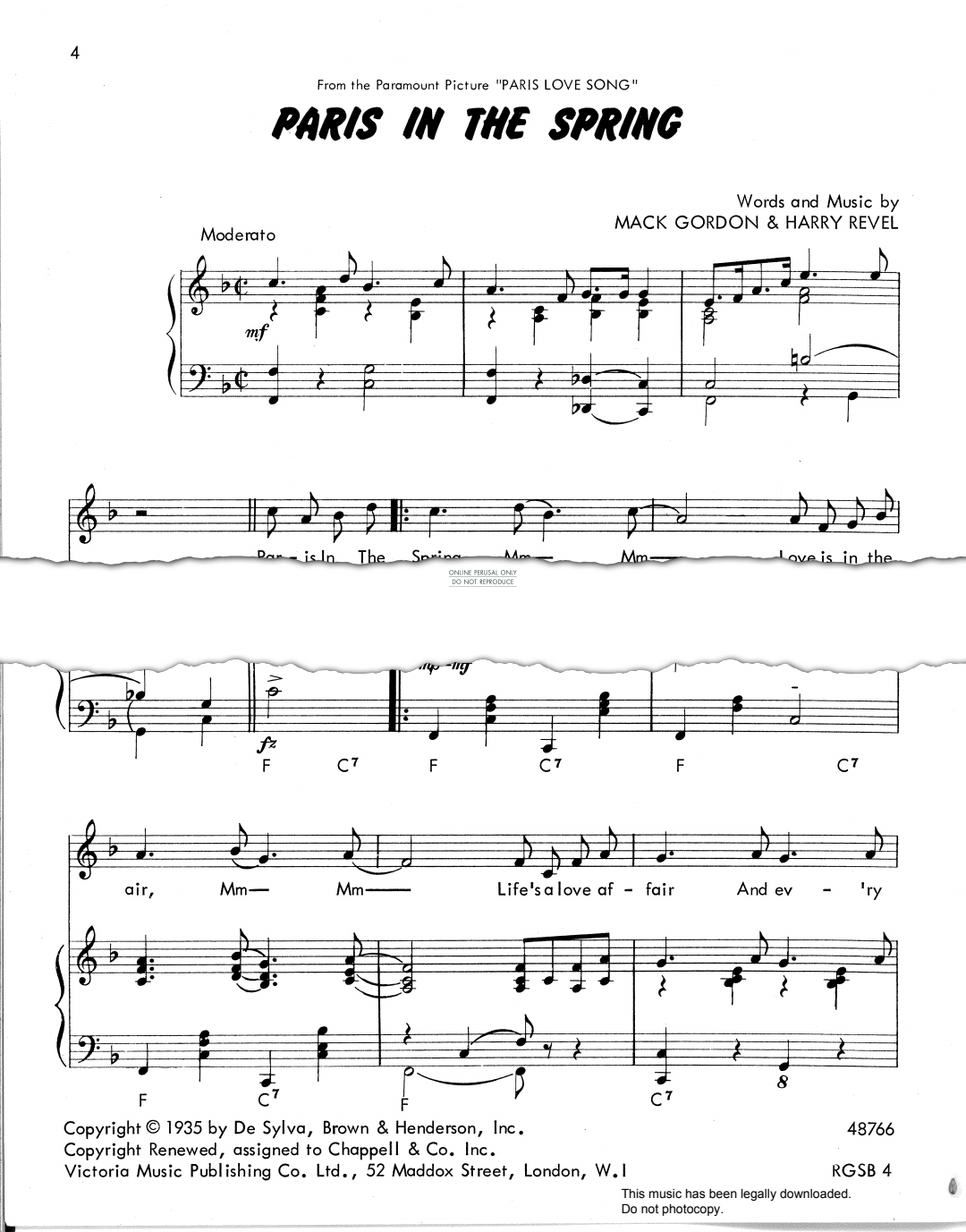 Paris In The Spring, written by Harry Revel with words by Mack Gordon, as performed by Bing Crosby, from the Paramount Picture 'Paris Love Song', arranged for voice and piano with guitar chords.