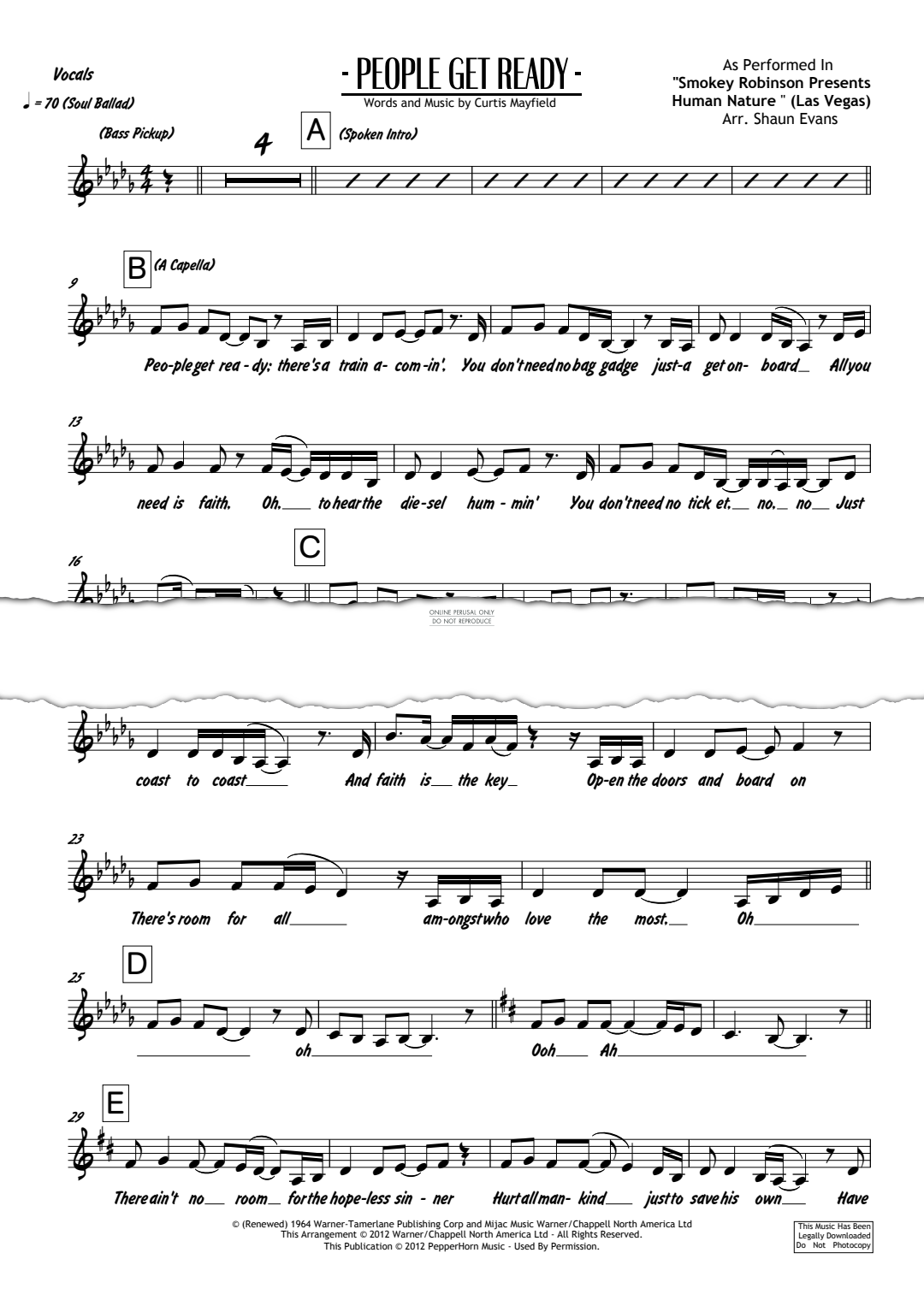 | Curtis Mayfield's moving, Gospel-infused pop hit 'People Get Ready' was named by Rolling Stone as the 24th greatest song of all time. The Rock & Roll Hall of Fame also identified the song as one of the 500 tunes that shaped the genre. This Human Nature treatment features their usual catchy vocal harmonies and a soulfully inspired arrangement. This chart has been professionally arragned for 2 Horns (Trumpet, Tenor Sax), 4 Rhythm (Bass, Guitar, Drums, Keyboards), Vocals & Background Vocals by Shaun Evans. It is presented as part of the PepperHorn Collections series from PepperHorn Music. |