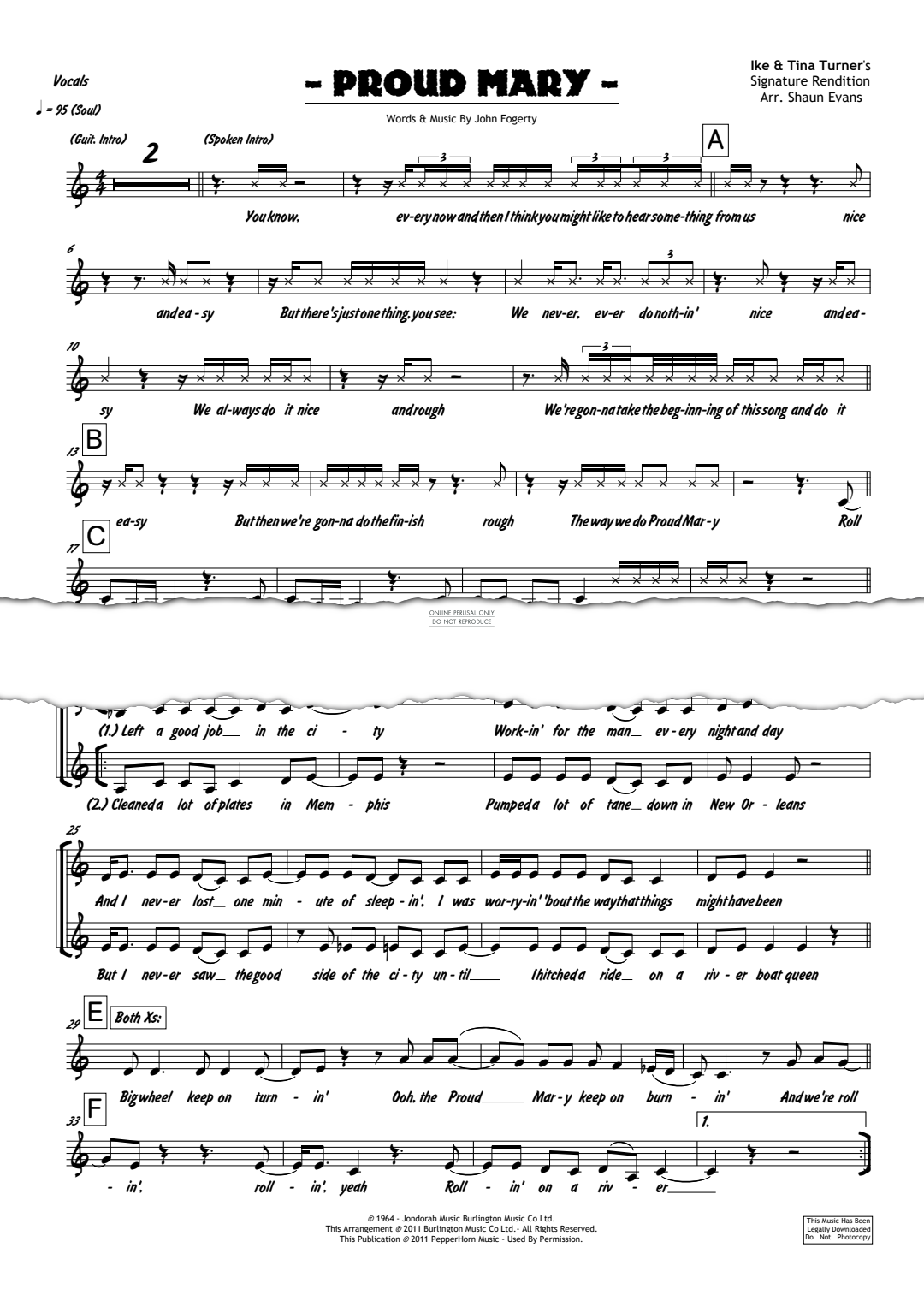 Ike & Tina Turner's 1971 spin on this bayou-inspired John Fogerty Rock favorite really put it on its head. One of Tina's signature tunes, this one 'starts off soft and then gets rough' as she lustily describes in the intro. It then breaks into the feverish, rock/blues pitch that it is reknown for -- and Proud Mary's easy bayou stylings would never be the same. This chart has been professionally arranged for 2 Horns (Trumpet & Tenor Sax), 4 Rhythm (Drums, Bass, Guitar, Keyboards), Vocals and Background Vocals by Shaun Evans. It is presented as part of the PepperHorn Collections series from PepperHorn Music.
