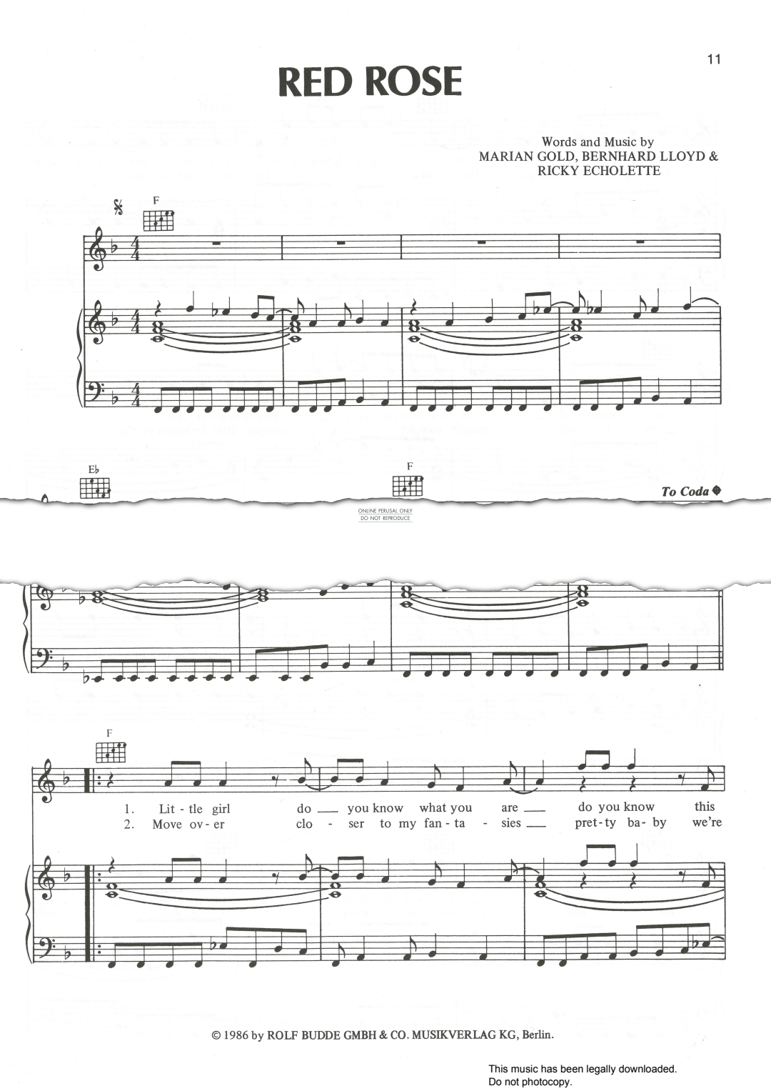 Red Rose written by Marian Gold, Bernhard Lloyd and Rick Echolette, as performed by Alphaville arranged for voice and piano with guitar chords.