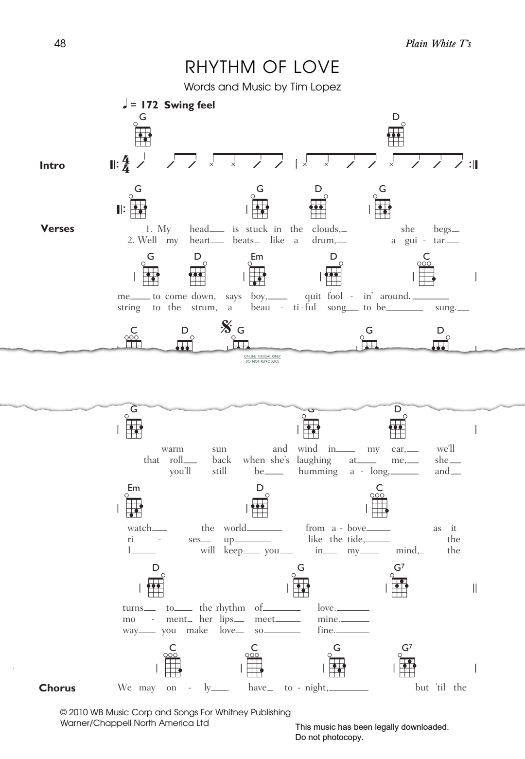 Rhythm Of Love, as recorded by Plain White T's. Arranged for voice with ukulele chords in digital sheet music format.