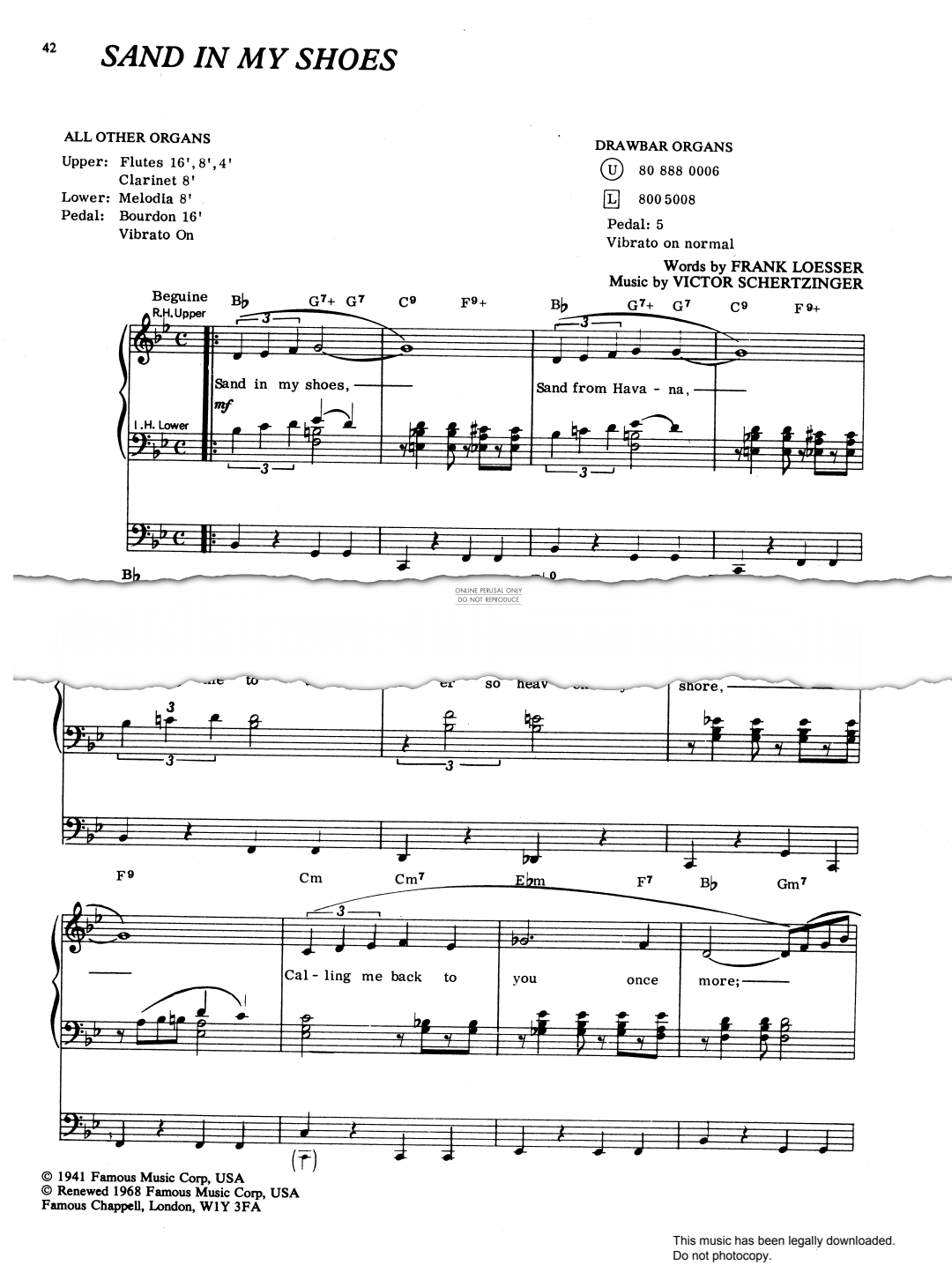 Sand In My Shoes written by Victor Schertzinger with words by Frank Loesser, in the key of Bb Major arranged for voice and organ with guitar chords.