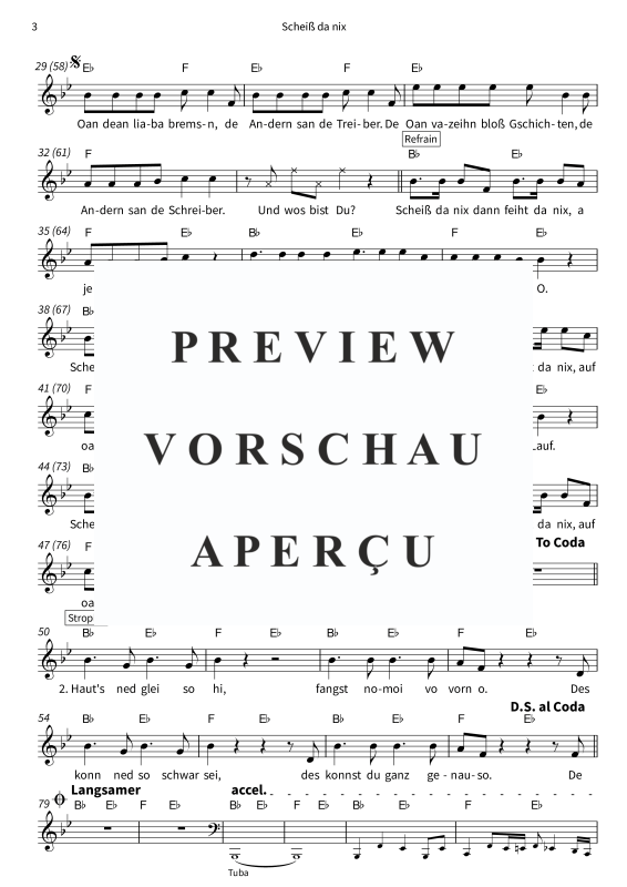 This sheet music book contains the sheet music for the song "Scheiß da nix" by DeSchoWieda. Edition for leadsheet in easy difficulty in B flat major.