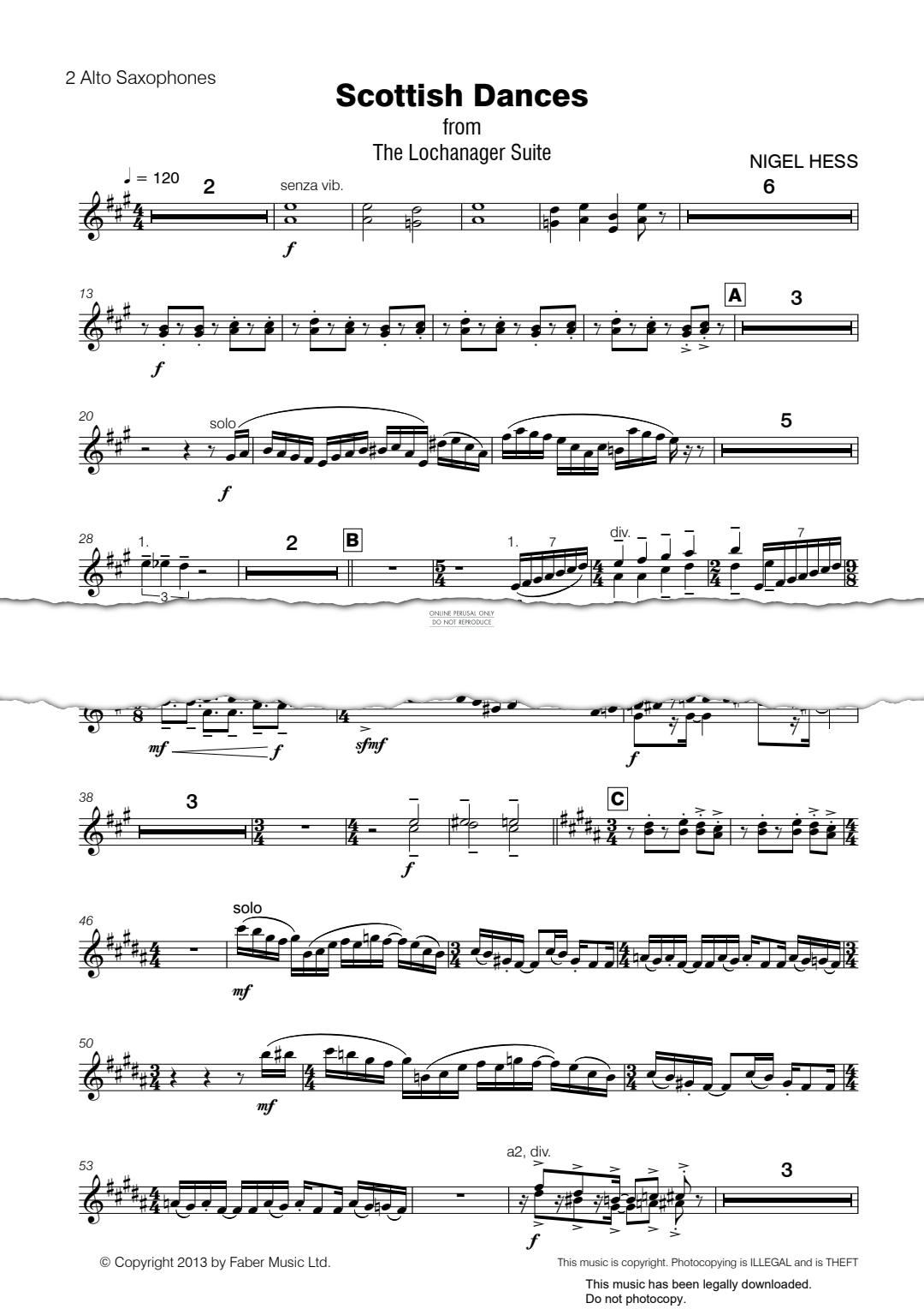 Scottish Dances taken from 'The Lochnagar Suite', composed by Nigel Hess. This is the alto saxophone part available in digital sheet music format.